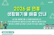 양주시= 주재영 기자 |양주시는 설 연휴 기간 시민과 방문객의 불편을 줄이기 위해 ‘2026년 설 연휴 생활폐기물 관리 대책’을 시행한다. 특별 관리 기간은 2월 14일부터 18일까지다. 연휴 기간 동안 종량제봉투, 음식물류 폐기물, 재활용품은 2월 14일과 16일에 정상 수거되며, 공동주택 음식물류 폐기물은 18일 별도 수거해 쓰레기 장기 적치를 방지할 계획이다. 또한 쓰레기 관련 민원과 긴급 상황에 대응하기 위해 상황근무반을 편성하는 등 비상 청소체계를 운영한다. 양주시 관계자는 “생활폐기물 감량과 수거 일정 준수를 위한 시민들의 협조가 필요하다”며 “배출은 수거일 전날 오후 8시부터 수거일 당일 오전 6시까지 지켜달라”고 당부했다.