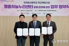 광장일보 주재영 기자 | 영종구 출범 원년을 맞아 올해 새롭게 개관한 ‘영종하늘누리센터’의 안정적·체계적 운영을 위해 인천시 중구가 인천시 교육청, 운서중학교와 손을 맞잡았다. 김정헌 인천 중구청장과 도성훈 인천시 교육감, 김성오 운서중학교장은 10일 오후 영종하늘누리센터 하늘배움터에서 이러한 내용의 ‘인천운서중 학교복합시설(영종하늘누리센터)의 운영과 관리에 관한 업무 실시협약’에 서명했다. ‘영종하늘누리센터’는 인천 중구가 운서중학교 부지 내 일부를 무상으로 제공받아 하늘초롱길 69 일원에 지하 1층, 지상 4층 연면적 5,635㎡ 규모로 건립한 ‘학교복합시설’이다. 지난 2024년 6월 첫 삽을 떠 올해 1월 건립 공사를 모두 마쳤으며, 3월 준공식을 개최한 후 현재는 운영 본격화에 행정력을 집중하고 있다. 특히 다함께돌봄센터 7호점(거점형), 육아종합지원센터, 가족센터, 영종하늘누리 작은도서관이 지난 2월부터 입주해 다양한 복지·문화 서비스를 구민들에게 제공하고 있다. 이번 협약은 지난 2021년 영종하늘누리센터 건립을 위해 체결한 기본 업무협약의 내용을 한층 더 구체화함으로써,