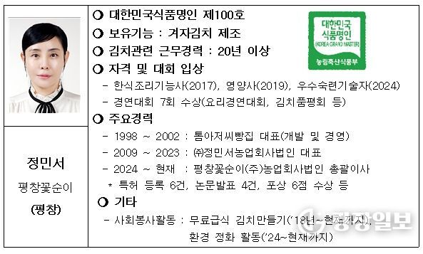 광장일보 이현나 기자 | 강원특별자치도는 농림축산식품부의 ‘2025년 대한민국 식품명인’ 평가에서 겨자김치로 평창군 꽃순이(주)농업회사법인(정민서 이사)이 신규 지정됐다고 밝혔다.
