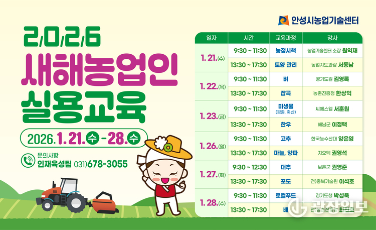 안성시= 주재영 기자 | 안성시는 2026년 새해농업인 실용교육을 오는 1월 21일(수)부터 28일(수)까지 6일간 총 12개 과목으로 운영한다고 밝혔다.