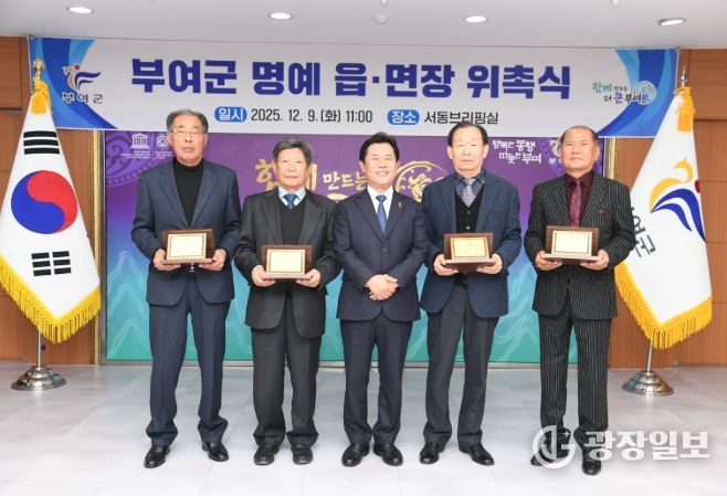 광장일보 주재영 기자 | 부여군은 부여군청 서동브리핑실에서 ‘2025년 부여군 명예 읍·면장 위촉식’을 개최하고, 지역사회에서 신망을 얻고 있는 인사 4명을 신임 명예 읍·면장으로 위촉했다고 11일 밝혔다.
