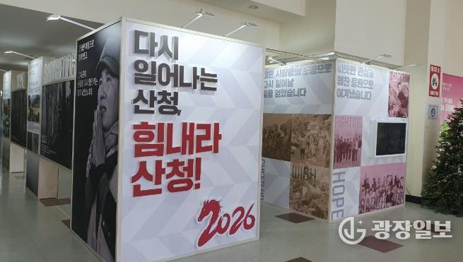전시 공간에는 피해 복구 및 지원 활동을 기록한 사진 전시를 비롯해 성인문해교실 어르신 시화전, 평생교육 산청기록가 과정 작품 전시 등을 마련했다.