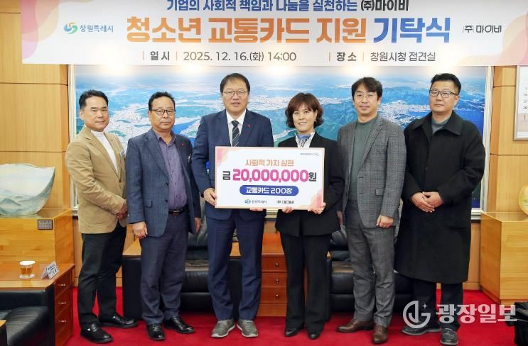 광장일보 주재영 기자 | 창원특례시는 16일 ㈜마이비가 사회공헌사업의 일환으로 저소득층 청소년의 교통비 부담 완화를 위해 교통카드 10만 원권 200장, 총 2,000만 원 상당을 기탁했다고 밝혔다.