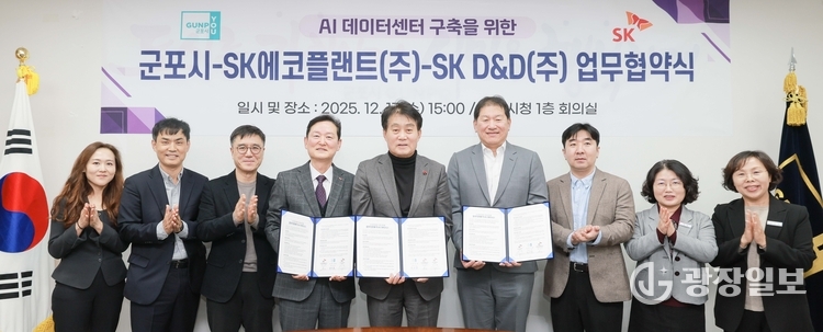 군포시= 주재영 기자 | 군포시(시장 하은호)는 지난 12월 17일 시청 회의실에서 SK에코플랜트㈜(솔루션 사업대표 송영규), SK디앤디㈜(대표 김도현)와 함께 **군포역세권 복합개발지구 내 AI 데이터센터 구축을 위한 민·관 상생협력 업무협약(MOU)**을 체결했다.