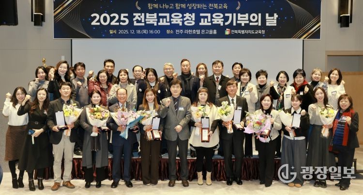 광장일보 주재영 기자 | 전북특별자치도교육청은 18일 ‘2025 전북교육청 교육기부의 날’ 행사를 개최해 올해 교육기부 활성화에 힘쓴 개인과 교직원, 유학생, 기관·단체 등 총 9명(팀)을 ‘2025년 교육기부 유공자’로 표창했다.
