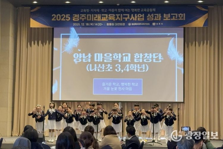 광장일보 주재영 기자 | 경주교육지원청은 2025년 12월 18일 오후 2시 20분, 황룡원 대연회장에서 “2025 경주미래교육지구 성과보고회”를 개최했다. 이번 보고회는 한 해 동안 추진된 미래교육지구 사업의 성과를 지역 교육공동체와 공유하기 위해 마련됐으며, 양남마을학교 어린이 합창단의 식전 공연을 시작으로 사업 소개, 성과 보고, 우수 사례 발표순으로 진행됐다.