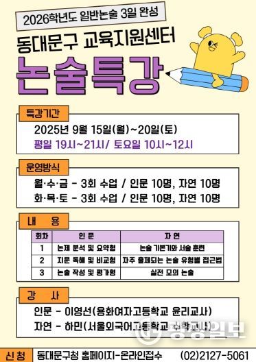 광장일보 주리아 기자 | 서울 동대문구는 ‘2026학년도 논술전형 대비 특강’을 9월 15일부터 20일까지 동대문구 교육지원센터(왕산로 25, 7층)에서 운영한다고 밝혔다.