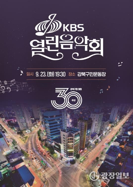 광장일보 주리아 기자 | 강북구는 개청 30주년을 맞아 오는 9월 23일 오후 7시 30분, 강북구민운동장에서 'KBS 열린음악회'를 개최하고, 오는 15일 오전 10시부터 공연 초대권을 선착순 배부한다.