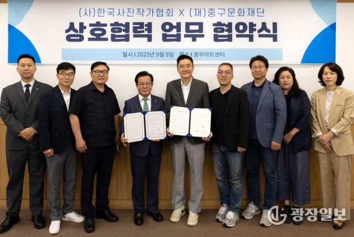 광장일보 주리아 기자 | 서울 중구문화재단과 (사)한국사진작가협회는 9일 충무아트센터에서 상호 협력을 위한 업무협약(MOU)을 체결했다. 이번 협약을 통해 양 기관은 사진예술에 대한 국민적 관심을 높이고, 전시·교육 등 다양한 사업을 상호협력할 계획이다.