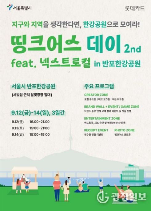 광장일보 주리아 기자 | 서울시는 롯데카드와 함께 9월 12일~9월 14일(3일) 반포한강공원에서 '띵크어스 데이 (feat. 넥스트로컬)'을 개최한다고 밝혔다.