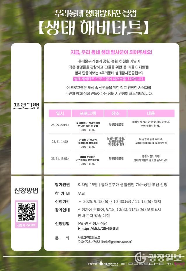 이날 행사에는 김기현 동대문구 부구청장, 마티아스 부세 포르쉐코리아 대표이사, 서울그린트러스트 관계자가 참여해 잡초 제거, 마사 멀칭, 식물 심기 등 빗물정원 유지·관리 활동을 펼쳤다. 참가자들은 생태 지도를 작성하며 서식처 관점에서 공원을 관찰, 도심 속 생태 가치와 회복 필요성을 직접 체감했다.