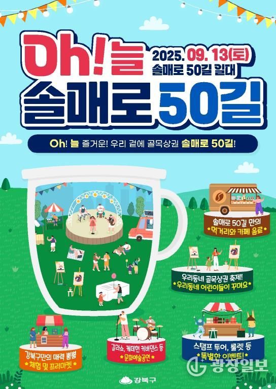 광장일보 주리아 기자 | 서울 강북구는 오는 13일 오전 11시부터 오후 6시까지 미아역 인근 솔매로50길 상권에서 ‘오(Oh)!늘, 솔매로50길 축제’를 개최한다고 밝혔다.