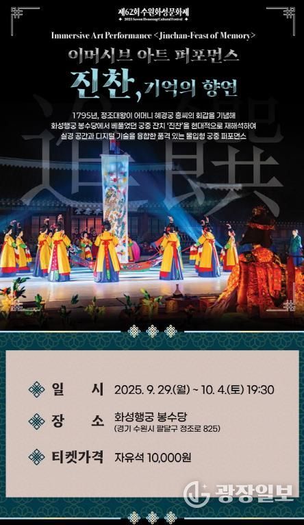 광장일보 나학천 기자 | 수원시는 제62회 수원화성문화제 기간 중 화성행궁 봉수당에서 이머시브 아트(몰입형 예술) 무용극 ‘진찬: 기억의 향연’을 선보인다.