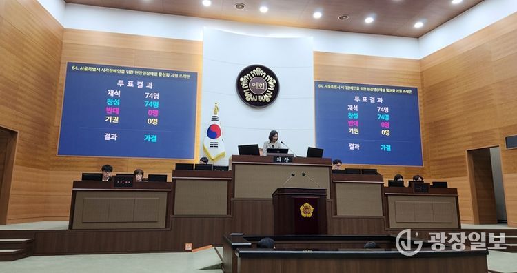 광장일보 주리아 기자 | 문성호 서울시의원(국민의힘, 서대문2)이 시각장애인을 위한 현장영상해설의 활성화를 통해 서울시 내 시각장애인들의 알 권리 충족 및 특정 분야에 대한 직접적인 체험 및 개발 경험의 기회를 마련하고자 함과 동시에 이러한 현장영상해설의 체계적인 지원과 효율적인 활성화를 위한 서울시 차원에서 보장하고자 하는 취지를 담아 제정한 ‘서울특별시 시각장애인을 위한 현장영상해설 활성화 지원 조례안’이 제332회 서울특별시의회 임시회 제5차 본회의에서 재석인원 74명 중 만장일치 찬성으로 가결됐음을 전했다.