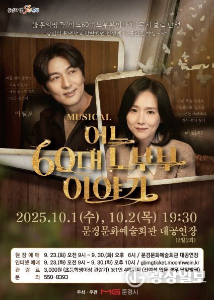 광장일보 주재영 기자 | 문경시는 평범하지만 특별한 우리들의 가족 이야기로 대학로에서 많은 사랑을 받았던 뮤지컬‘어느 60대 노부부 이야기’공연을 10월 1일 19:30, 2일 19:30에 문경문화예술회관 대공연장에서 선보인다.