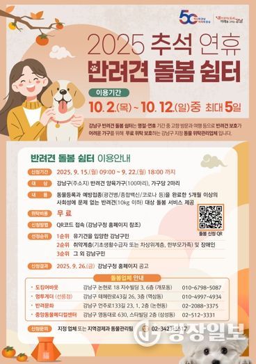 광장일보 주리아 기자 | 꿈이 모이는 도시, 미래를 그리는 강남구가 추석 연휴를 앞두고 구민들의 반려견 돌봄 부담을 덜기 위해 ‘반려견 돌봄 쉼터’를 운영한다. 신청은 9월 15일부터 22일까지 받으며, 선정된 반려견은 10월 2일부터 12일 사이 최대 5일간 무료로 돌봄 서비스를 이용할 수 있다.