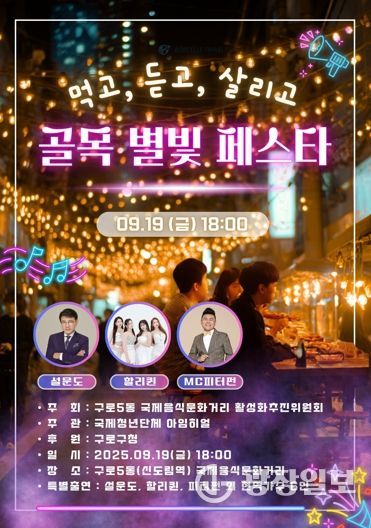 광장일보 주리아 기자 | 구로구가 9월 19일 구로5동 새말로16길 국제음식문화거리에서 ‘골목별빛 페스타 – 먹고, 듣고, 살리고!’를 연다. 이번 행사는 구로5동 국제음식문화거리 활성화 추진위원회가 주최하며, 오후 6시부터 9시까지 약 3시간 동안 다양한 볼거리와 즐길 거리를 제공할 예정이다.