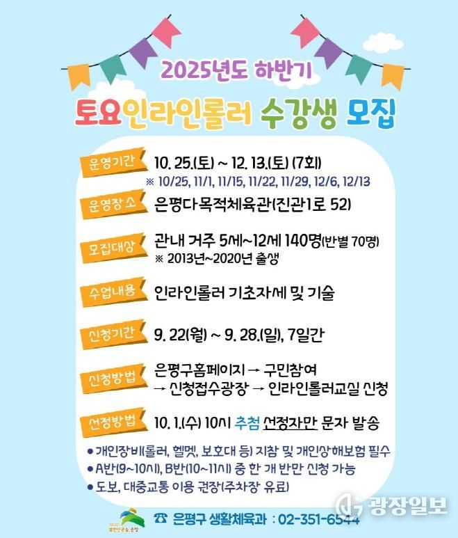 광장일보 주리아 기자 | 서울 은평구는 관내 어린이의 생활체육능력 향상을 위한 ‘하반기 토요 인라인롤러 교실’ 참여자를 오는 22일부터 28일까지 모집한다고 밝혔다.