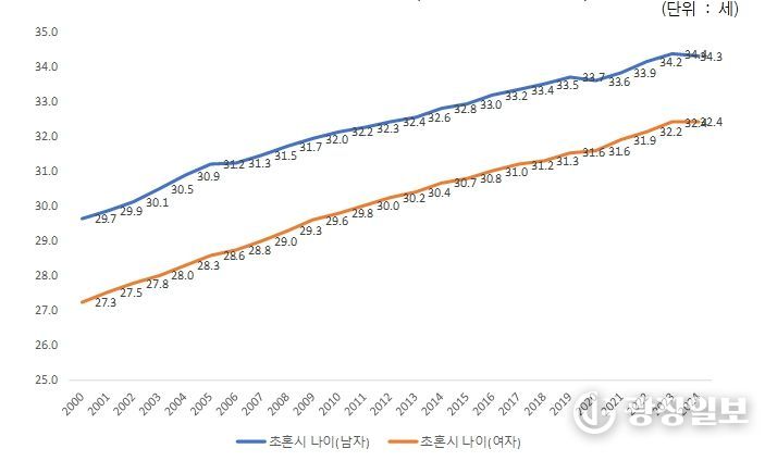 이혼은 전반적으로 감소세를 보였다. ‘이혼 건수’는 감소했지만 평균 이혼 연령은 높아져 2024년에는 남성 51.9세, 여성 49.4세로 '00년(남성 40.8세, 여성 37.4세)에 비해 10년 이상 상승했다. 60세 이상 ‘황혼이혼’은 2000년 이혼 건수 3%대에서 2024년 25% 수준까지 대폭 늘었다.