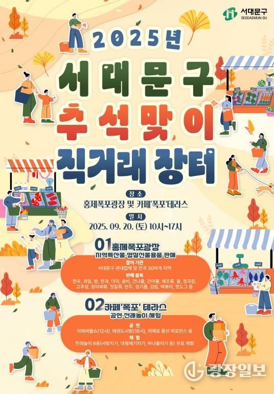 구는 이달 20일 토요일 오전 10시부터 오후 5시까지 홍제폭포광장과 카페 ‘폭포’ 테라스 일대에서 ‘추석맞이 직거래장터’를 개최한다.