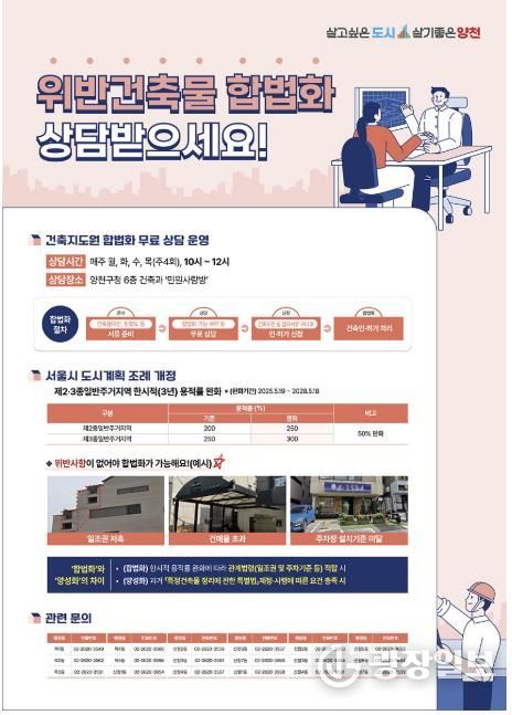 광장일보 주리아 기자 | 양천구는 서울시 도시계획조례 개정으로 제2·3종 일반주거지역 용적률이 한시적으로 완화됨에 따라, 건축사가 참여하는 전문 상담센터를 운영해 위반건축물 합법화 절차를 지원한다고 16일 밝혔다.