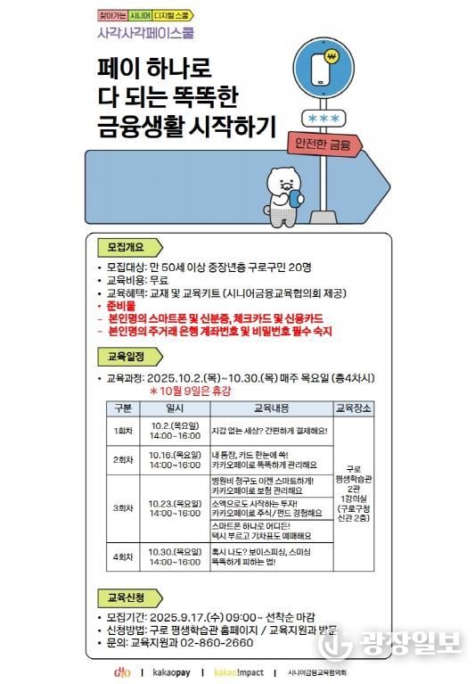 광장일보 주리아 기자 | 구로구가 오는 10월 구로평생학습관(구로구청 신관 2층)에서 중장년층 주민의 디지털 금융 역량 강화를 위한 ‘찾아가는 시니어 디지털스쿨’을 운영한다.