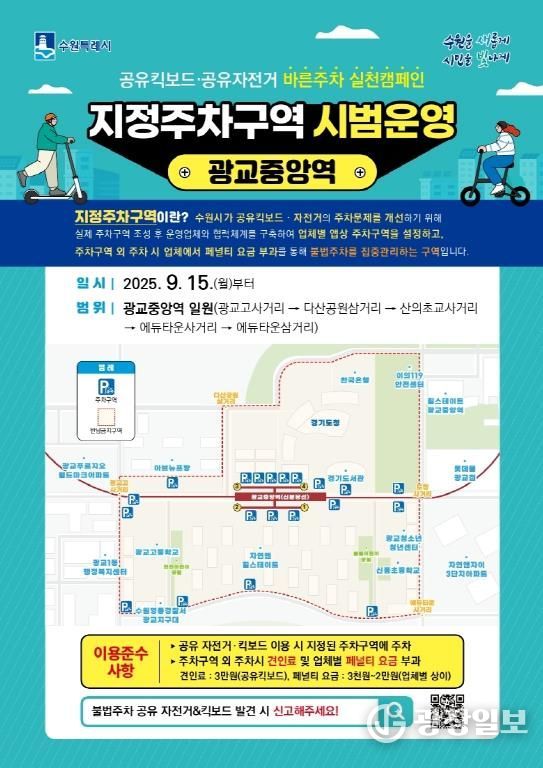 광장일보 나학천 기자 | 수원시가 광교중앙역 일원에서 ‘공유 자전거·킥보드(PM) 지정주차구역’을 시범 운영한다.