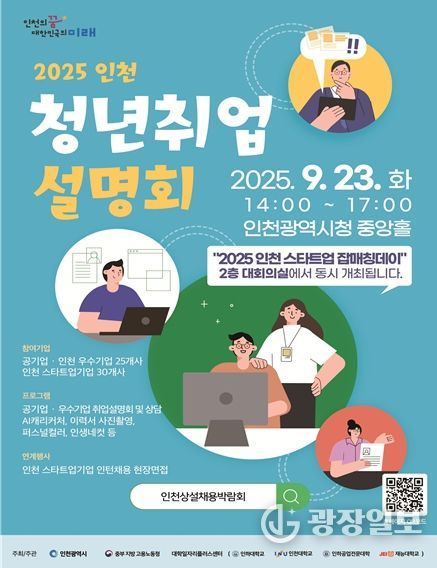 광장일보 주재영 기자 | 인천광역시는 오는 9월 23일 시청 중앙홀에서 ‘2025 인천 청년 취업설명회’를 개최한다고 밝혔다. 이번 행사는 청년들에게 공기업·민간기업·신생기업(startup) 등 다양한 취업 기회를 제공하기 위해 마련됐다.