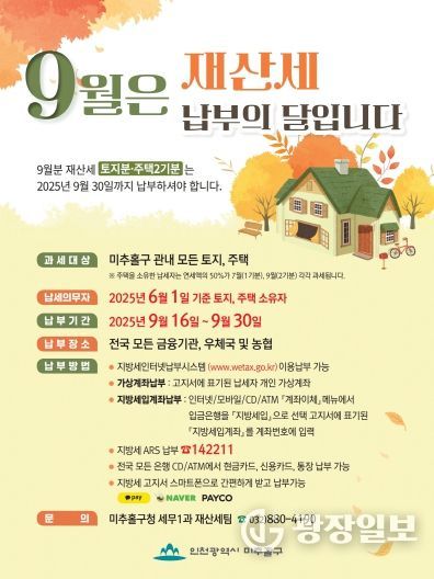 광장일보 주재영 기자 | 인천 미추홀구는 9월 정기분 재산세(토지분 및 주택 2기분) 518억 원, 21만 2천여 건을 부과했다고 16일 밝혔다.