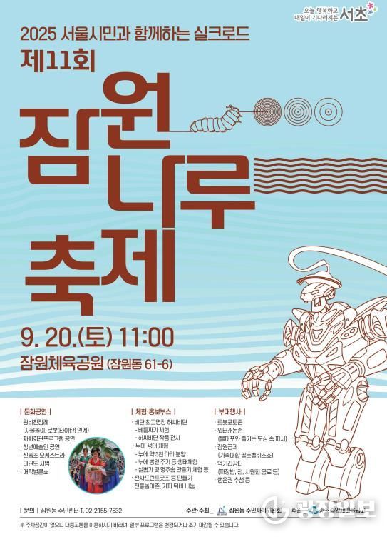 문화공연과 부대행사 역시 다채롭게 진행된다. 메인 무대에서는 매직벌룬쇼, 신동초등학교 학생 오케스트라 연주, 태권도 시범, 서초 청년예술인 공연 등이 펼쳐진다. 부대행사로는 가족 단위로 참여할 수 있는 퀴즈쇼 ‘잠원급제’가 예정돼 있다. 잠원동, 누에와 명주 등 잠사 관련 문제의 정답을 맞히고 푸짐한 상품을 받을 수 있어 주민들의 많은 참여가 예상된다.