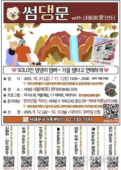 광장일보 주리아 기자 | 서대문구는 서대문구가족센터가 10월 31일과 11월 1일 서대문 내품애(愛)센터(모래내로 333)에서 반려견을 키우는 미혼남녀 만남 행사 ‘썸댕문 with 내품애센터’를 개최한다고 17일 밝혔다.