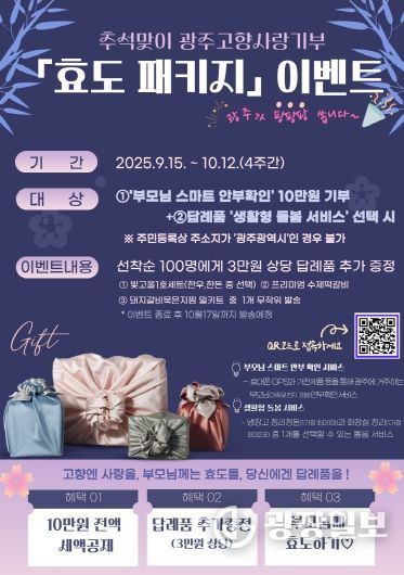 광주광역시는 오는 10월12일까지 고향사랑기부제 참여를 독려하고 부모님 돌봄서비스 이용을 장려하기 위해 ‘추석맞이 효도패키지 이벤트’를 진행한다.