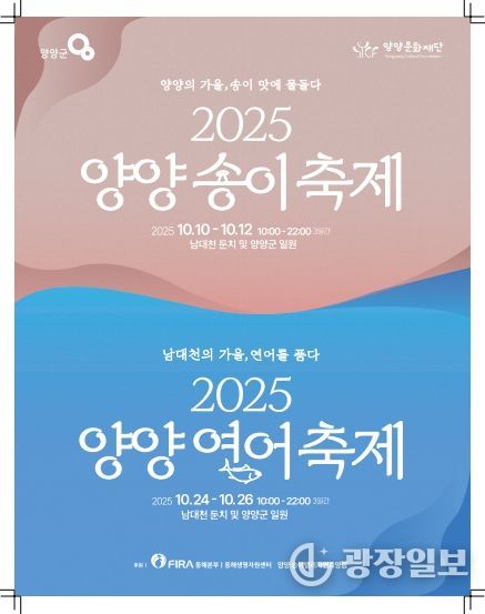 광장일보 이현나 기자 | 양양군은 오는 10월 10일부터 12일까지 3일간 ‘2025 양양송이축제’를, 이어 10월 24일부터 26일까지 3일간 ‘2025 양양연어축제’를 개최한다고 밝혔다. 두 축제 모두 양양읍 남대천 둔치 일원에서 열리며, 매일 오전 10시부터 밤 10시까지 운영된다.