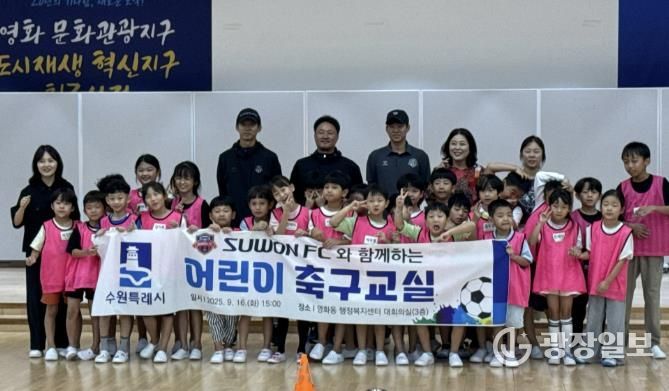 광장일보 나학천 기자 | 수원시 장안구 영화동은 지난 16일, 영화동 행정복지센터에서 수원FC와 함께하는 ‘어린이 축구교실 일일특강’을 진행했다.
