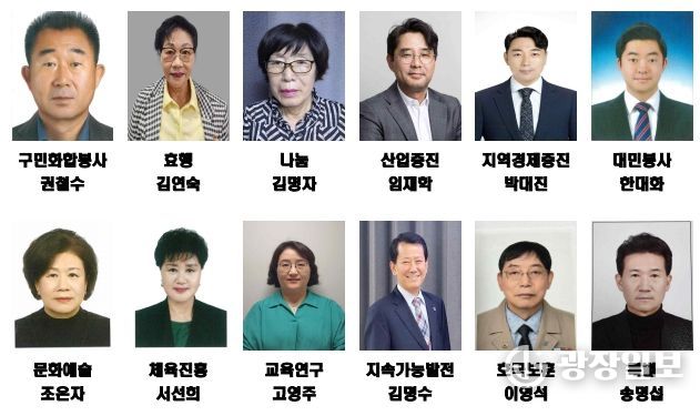 부문별 수상자로는 ▲구민화합봉사 부문 권철수(남, 69세) ▲효행 부문 김연숙(여, 75세) ▲나눔 부문 김명자(여, 66세) ▲산업증진 부문 임재학(남, 51세) ▲지역경제증진 부문 박대진(남, 54세) ▲대민봉사 부문 한대화(남, 34세) ▲문화예술 부문 조은자(여, 63세) ▲체육진흥 부문 서선희(여, 66세) ▲교육연구 부문 고영주(여, 48세) ▲지속가능발전 부문 김명수(남, 67세) ▲호국보훈 부문 이영석(남, 77세) ▲특별 부문 송명섭(남, 61세) 등이다.