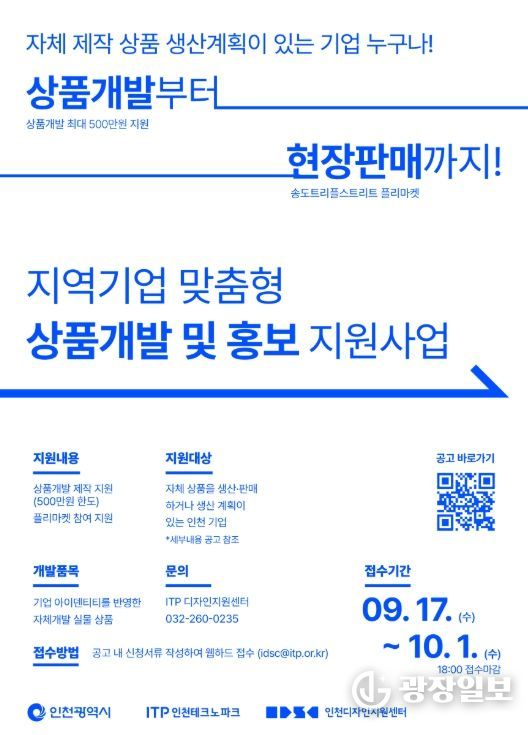 광장일보 주재영 기자 | 인천테크노파크(인천TP)는 오는 10월 1일까지 ‘2025년도 인천광역시 지역기업 맞춤형 상품개발 및 홍보 지원사업’에 참여할 중소기업을 모집한다.