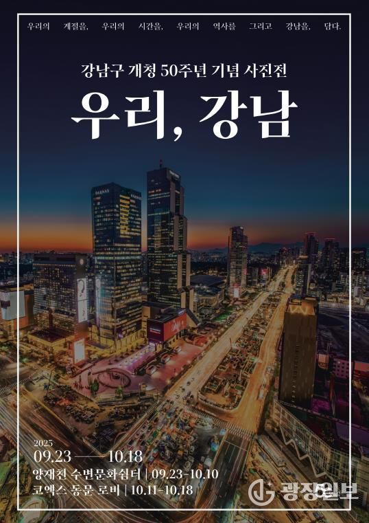 광장일보 주리아 기자 | 꿈이 모이는 도시, 미래를 그리는 강남구가 개청 50주년을 맞아 강남의 변화와 일상을 기록한 기념 사진전 ‘우리, 강남’을 연다. 전시는 9월 23일~10월 10일 양재천 수변문화쉼터, 이어 10월 11일~10월 18일 코엑스 동문 로비에서 야외 순회로 진행돼 더 많은 시민이 일상 동선에서 자연스럽게 관람할 수 있다.