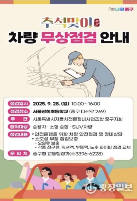광장일보 주리아 기자 | 서울 중구가 오는 28일 서울특별시자동차전문정비사업조합 중구지회와 함께‘추석맞이 차량 무상 점검’을 실시한다. 장거리 주행이 많은 추석 귀성길에 주민들이 사고 없이 안전하고 즐거운 명절을 보내도록 지원하기 위해서다.