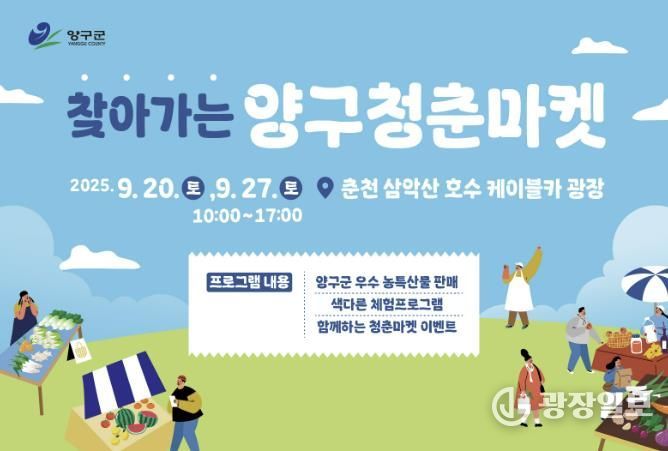 광장일보 이현나 기자 | 양구군은 지역 농가의 안정적인 판로 확보와 소득 증대를 위해 ‘2025 찾아가는 양구 청춘마켓’을 오는 9월 20일과 27일, 양일간 춘천시 삼악산 호수 케이블카 광장에서 운영한다.