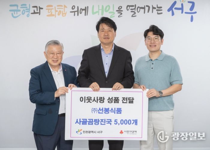 광장일보 주재영 기자 | 인천 서구는 지난 17일 오류동 소재 식품제조가공업체 ㈜선봉식품(대표 고종국)이 사골곰탕 5,000개(시가 1,400만 원 상당)를 기부했다고 18일 밝혔다.