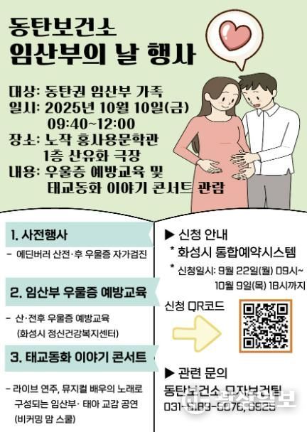 기념행사에서는 동탄권역 예비 부모 35쌍(70명)을 대상으로, ▲산전·후 우울증 예방 특강(화성시정신건강복지센터) ▲태교 동화 이야기 콘서트 등 임산부를 위한 프로그램이 운영된다.