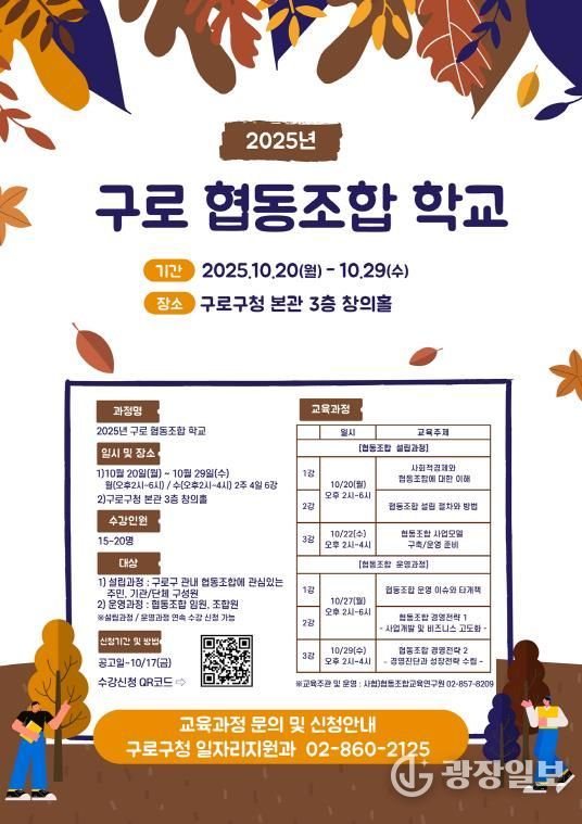 광장일보 주리아 기자 | 구로구가 협동조합에 대한 주민의 관심을 높이고, 실질적인 설립·운영 역량을 키우기 위한 ‘2025년 구로 협동조합학교’를 오는 10월 20일부터 운영한다.