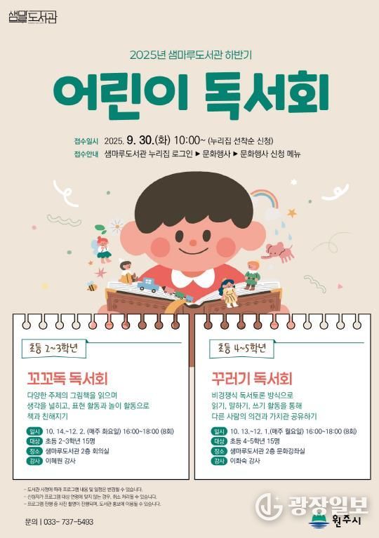 광장일보 이현나 기자 | 원주시 샘마루도서관은 10월 13일부터 관내 초등학생을 대상으로 하반기 어린이 독서회를 운영한다.