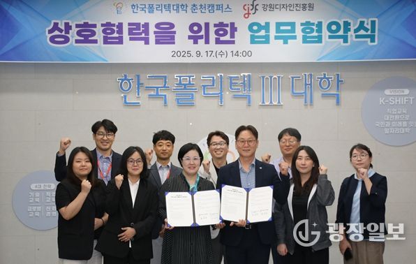 광장일보 이현나 기자 | 강원디자인진흥원은 9월 17일 한국폴리텍Ⅲ대학 춘천캠퍼스(학장 지경배, ‘한국폴리텍Ⅲ대학’)과 디자인산업 발전과 지역 인재 양성 상호협력을 위한 업무협약을 체결했다.