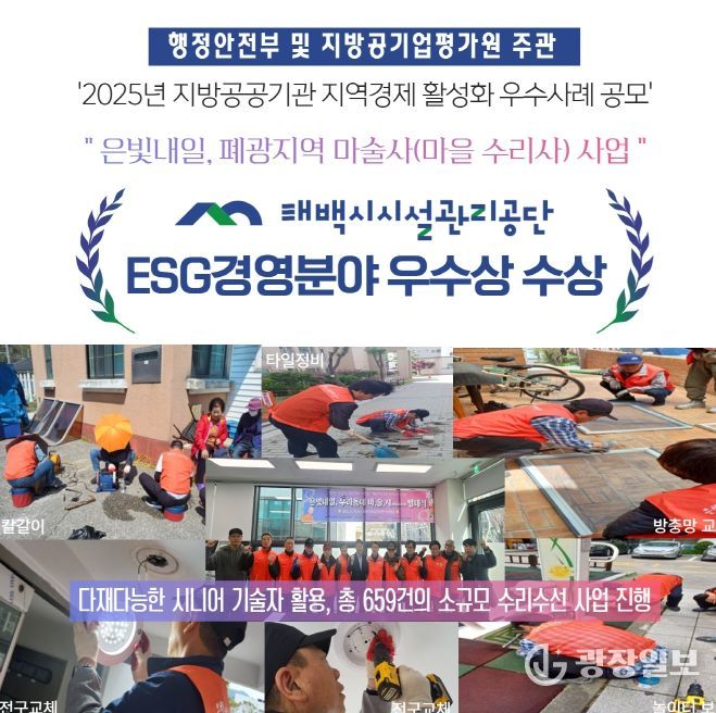 광장일보 이현나 기자 | 태백시시설관리공단은 행정안전부와 지방공기업평가원이 주최한 '2025년 지방공공기관 지역경제 활성화 우수사례 공모'에서 ESG 경영 등 사회적 가치 실현 분야 ‘우수상’을 수상했다고 밝혔다.