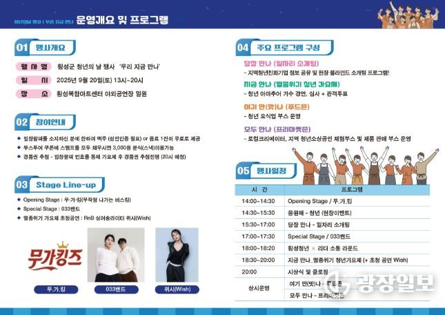 광장일보 이현나 기자 | 횡성군은 지역 청년들의 사회 참여 확대와 경제적 역량 강화를 위해 20일, 횡성복합아트센터 야외공연장 일원에서 ‘2025 청년의 날 행사’를 성대하게 개최한다.