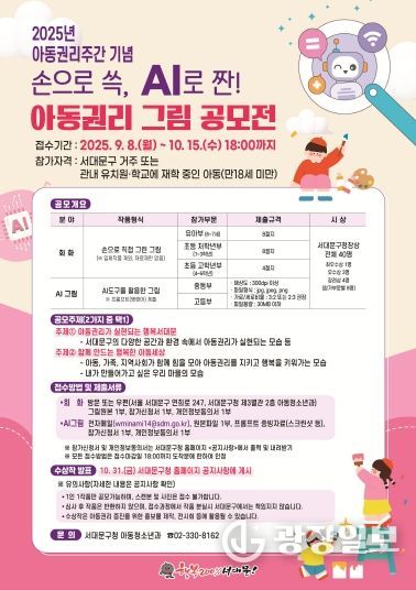 광장일보 주리아 기자 | 서대문구가 11월 셋째 주 아동권리주간을 기념해 10월 15일까지 ‘손으로 쓱, AI로 짠! 2025년 아동권리 그림 공모’를 진행한다.