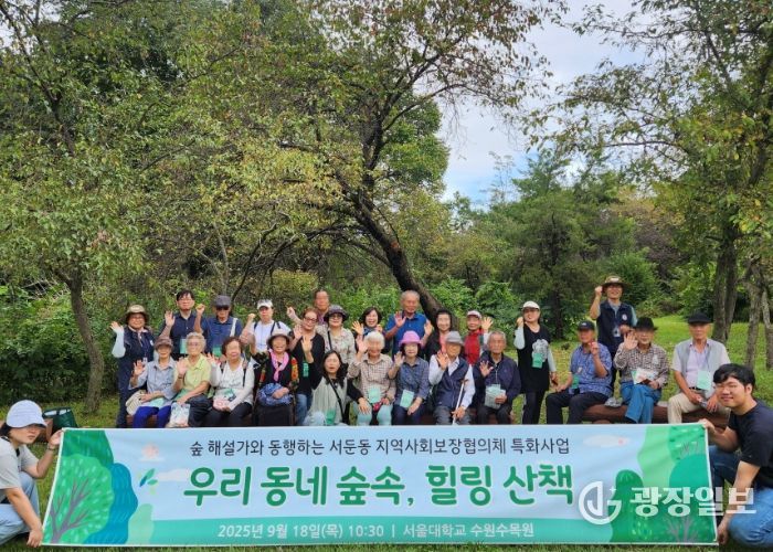 광장일보 나학천 기자 | 수원시 권선구 서둔동 지역사회보장협의체는 지난 18일, 관내 어르신 20명을 모시고 서울대농대 수원수목원에서‘우리 동네 숲속, 힐링 산책’숲 체험 나들이를 진행했다.
