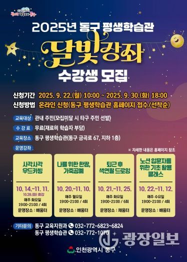 광장일보 주재영 기자 | 인천 동구는 구민들의 평생학습 참여 기회 확대하기 위하여 야간에 진행하는 ‘달빛강좌’를 개설하고 수강생을 모집한다고 밝혔다.