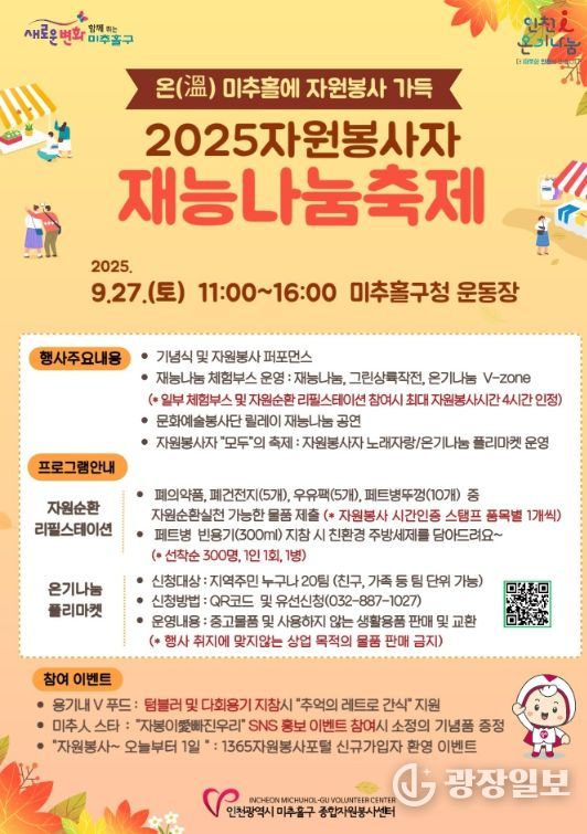 광장일보 주재영 기자 | 인천 미추홀구종합자원봉사센터는 오는 27일 미추홀구청 운동장에서 ‘온(溫) 미추홀에 자원봉사 가득 - 2025 자원봉사자 재능 나눔 축제’를 개최한다.